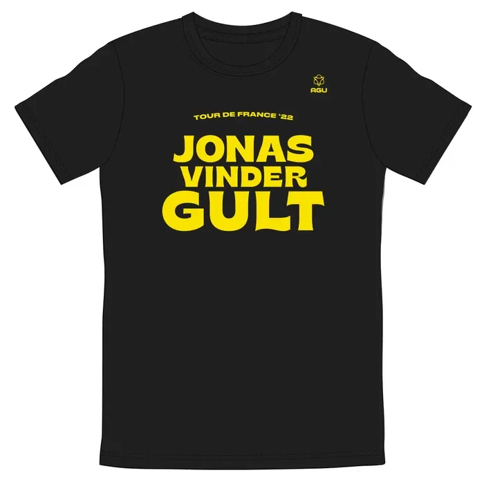 Het T-shirt ‘Jonas Vinder Gult’. Geïnspireerd door Jonas zelf met in het Deens de betekenis: Jonas wint geel. Bestel jij dit shirt als herinnering aan de overwinning van Jonas Vingegaard?