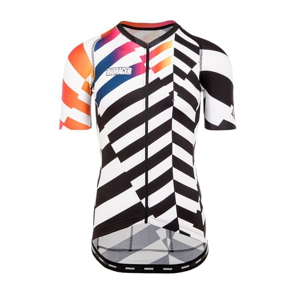 De voorkant van de nauwsluitende jersey is gemaakt van Lycra die in twee richtingen rekbaar is voor maximale flexibiliteit, en de achterkant van Lycra die in één richting rekt om de jersey op zijn plaats te houden.